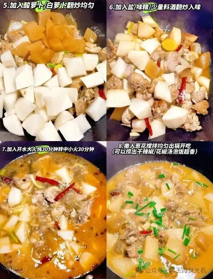 3️⃣加入酸萝卜、白萝卜翻炒均匀,加生抽、味精翻炒入味,撒上葱花出锅