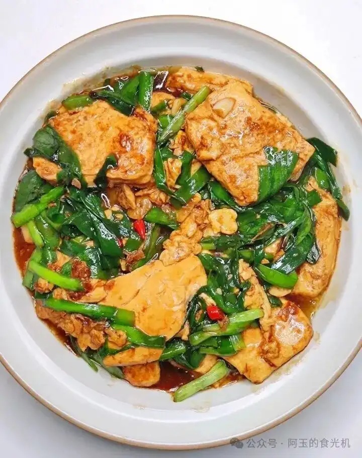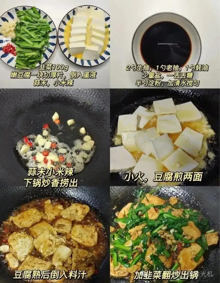 3️⃣豆腐煎熟加入料汁、韭菜,翻炒熟出锅