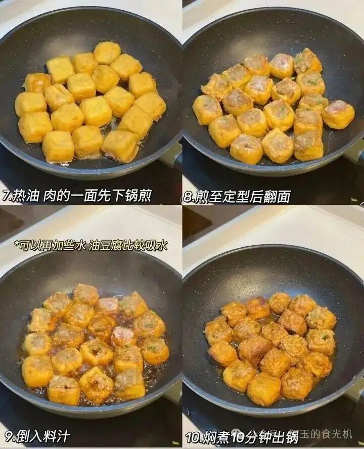 3️⃣油热后下入油豆腐,肉的一面煎至定型后翻面,倒入料汁和一小碗水,焖煮10分钟出锅