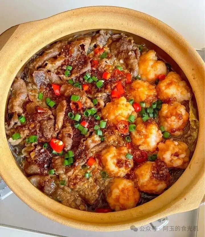 2️⃣锅中铺上娃娃菜、金针菇、粉丝、煮熟的虾滑、肥牛