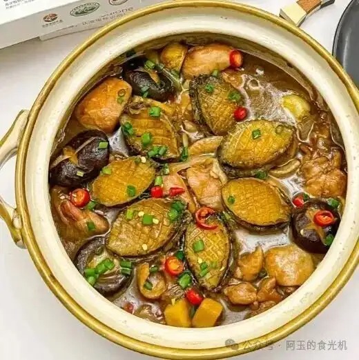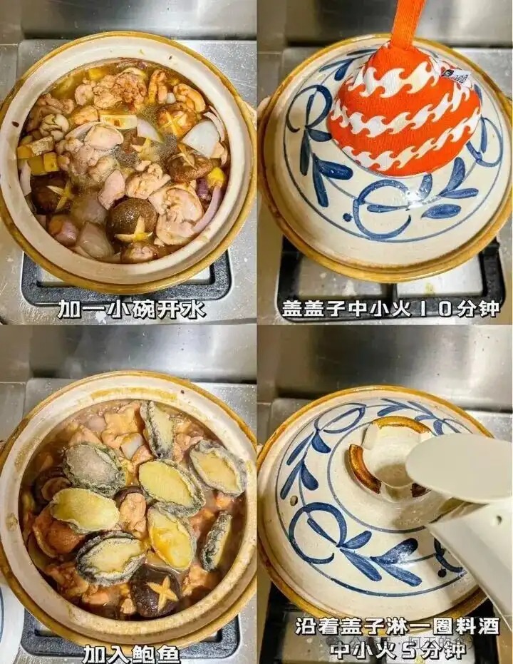 4️⃣加一小碗开水,盖盖中小火煮10分钟,加入鲍鱼,盖盖子沿着锅盖淋一圈料酒,中小火焖煮5分钟,出锅撒上葱花、小米辣