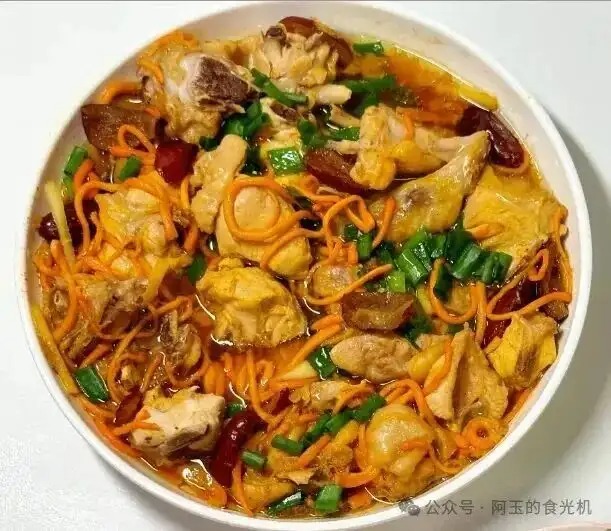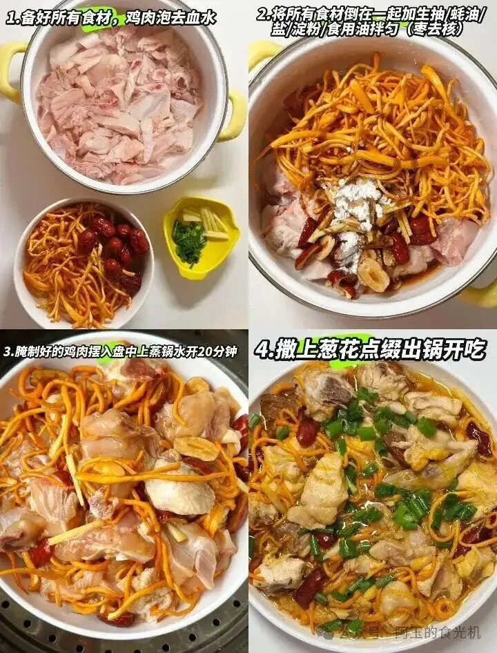 1️⃣鸡肉切块泡出血水,将鸡肉、虫草花、去核的枣倒在一起,加生抽、蚝油、盐、淀粉、油拌匀腌制15分钟