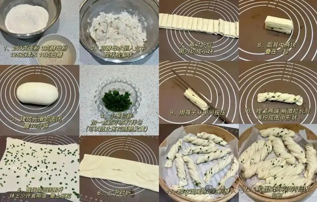 2️⃣醒好的面团,擀成长方形薄片,抹适量油、葱花,对折后再对折,切成小块