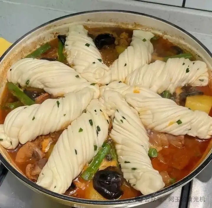 3️⃣淋上炒好的料汁加入一碗开水,盖盖子中小火焖煮8分钟撒葱花出锅