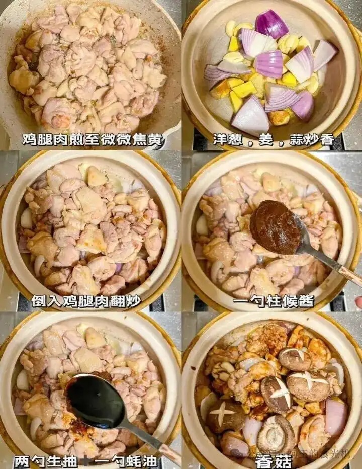 3️⃣砂锅中倒点油、大蒜、生姜、洋葱炒香,放入鸡腿肉、香菇、勺柱候酱、生抽、蚝油,翻炒均匀