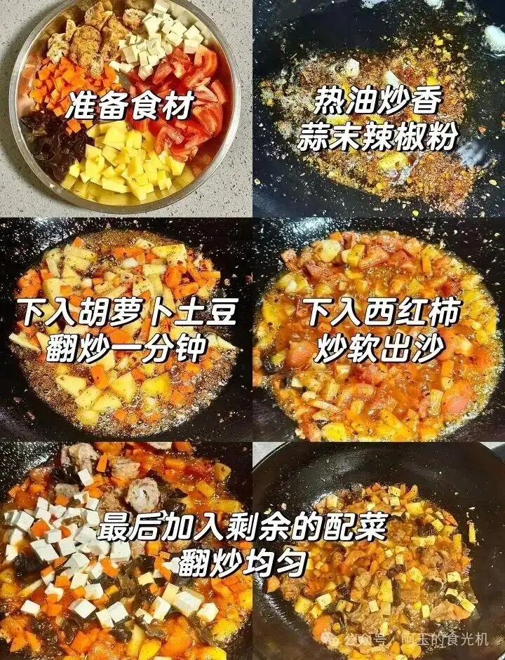 1️⃣锅中热油炒香蒜末、辣椒粉,加入土豆、胡萝卜翻炒几下