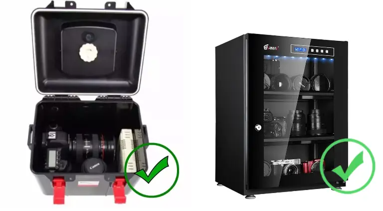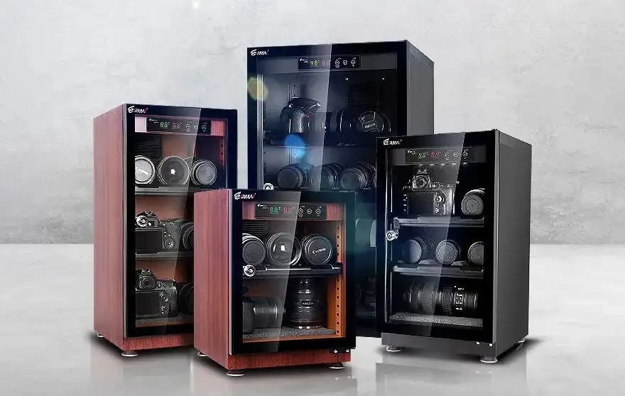 特别是梅雨季节,是发霉的高峰期,推荐两个防潮的东西,一是左边的防潮箱+吸湿卡(需要定时充电),二是右边的电子防潮柜,只需要插上电,将湿度设置到35-45之间,就可以防止镜头发霉。
