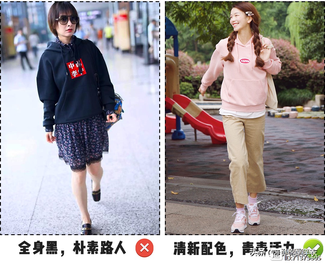 春天的穿搭还是很好搭配的,颜色的深浅也是体现你时尚感的关键,若要显得时髦一些,尽量避免深色系的服饰,比如下图左边的全身黑穿搭,实在是很路人,不容易吸引视线,右边的浅色搭配显得就减龄许多,还会降低整体的重量感,把年轻小姐姐的活力展现出来。