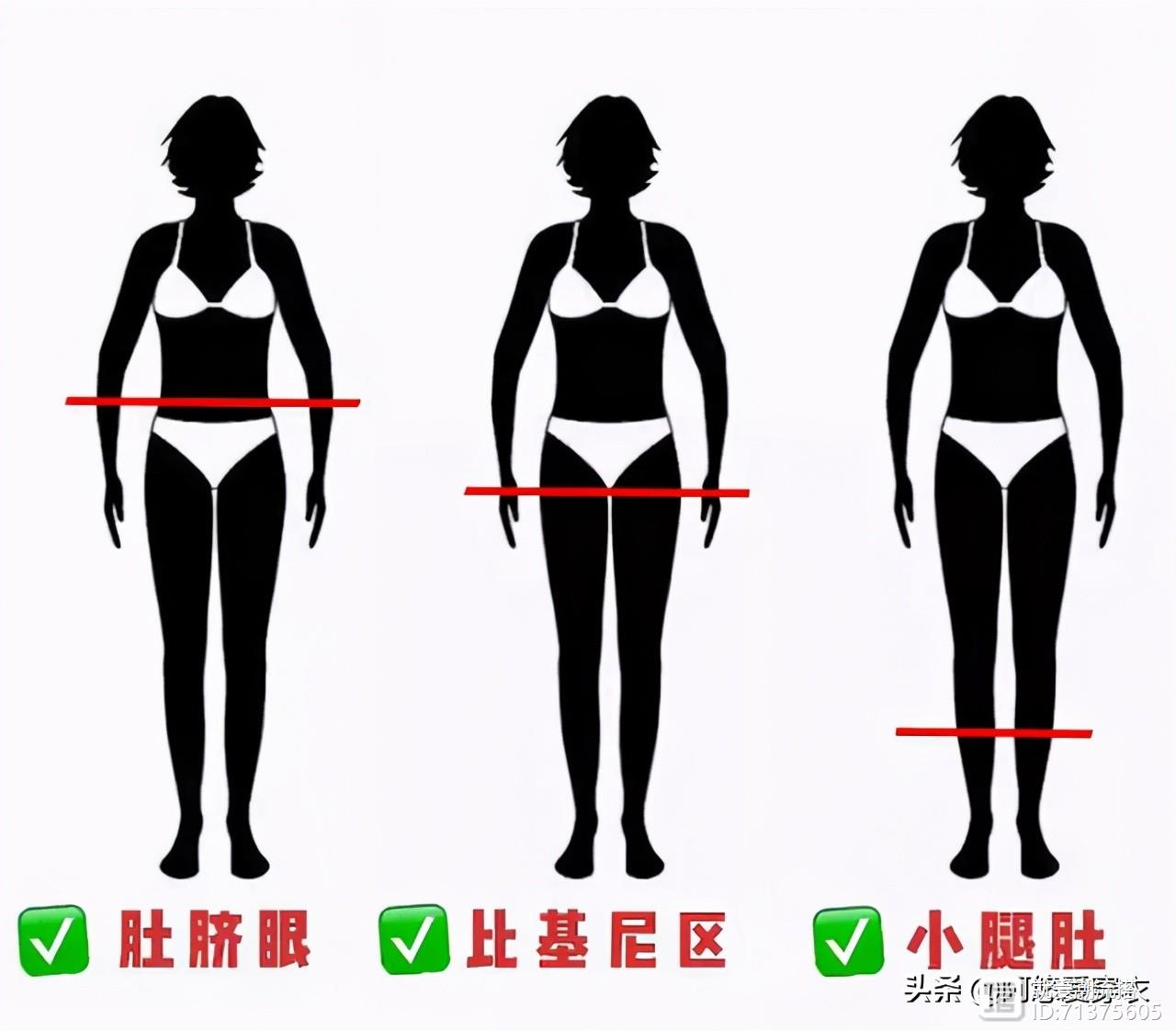 我们可以把自己的身体划分成三部分,第一部分位肚脐眼上面,第二部分是肚脐眼到比基尼区,第三部分是比基尼区搭配小腿肚。如果身材好的话,小腿肚到比基尼区域一般要长一些,这也就是俗称的腿长,如果你肚脐眼到比基尼区长度超过整体身材的五分之一,那你的身材比例可能就不算好,甚至有身材五五分的情况存在。