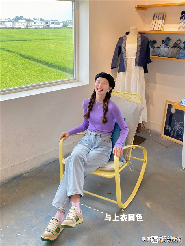 色彩之间还可以来一个小呼应,比如下面的袜子和上衣就呼应起来了,浅紫色的袜子和紫色打底衫都是很温柔的色彩,穿起来还很青春。
