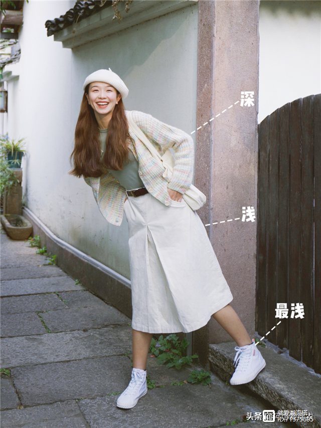 以及下面的米色搭配也是很好看的,米白色针织衫+米白色半身裙+白色平底鞋,简单的配色可以展现出时尚感。但是同色系之间也有深浅之分,通过不同的深浅程度可以达到不同的显瘦效果,塑造出层次感。
