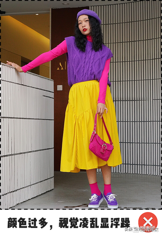 但是如果上下的单品色彩冲击感太强,就会给人一种很繁杂的感觉,而且容易分割你本身就不太好的身材,显得五五分。