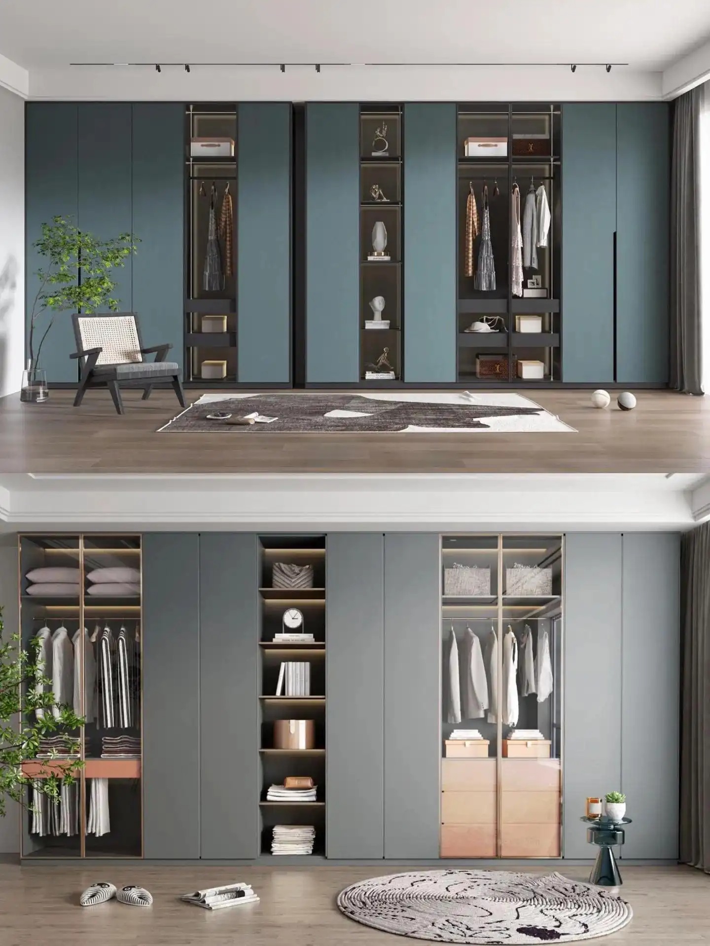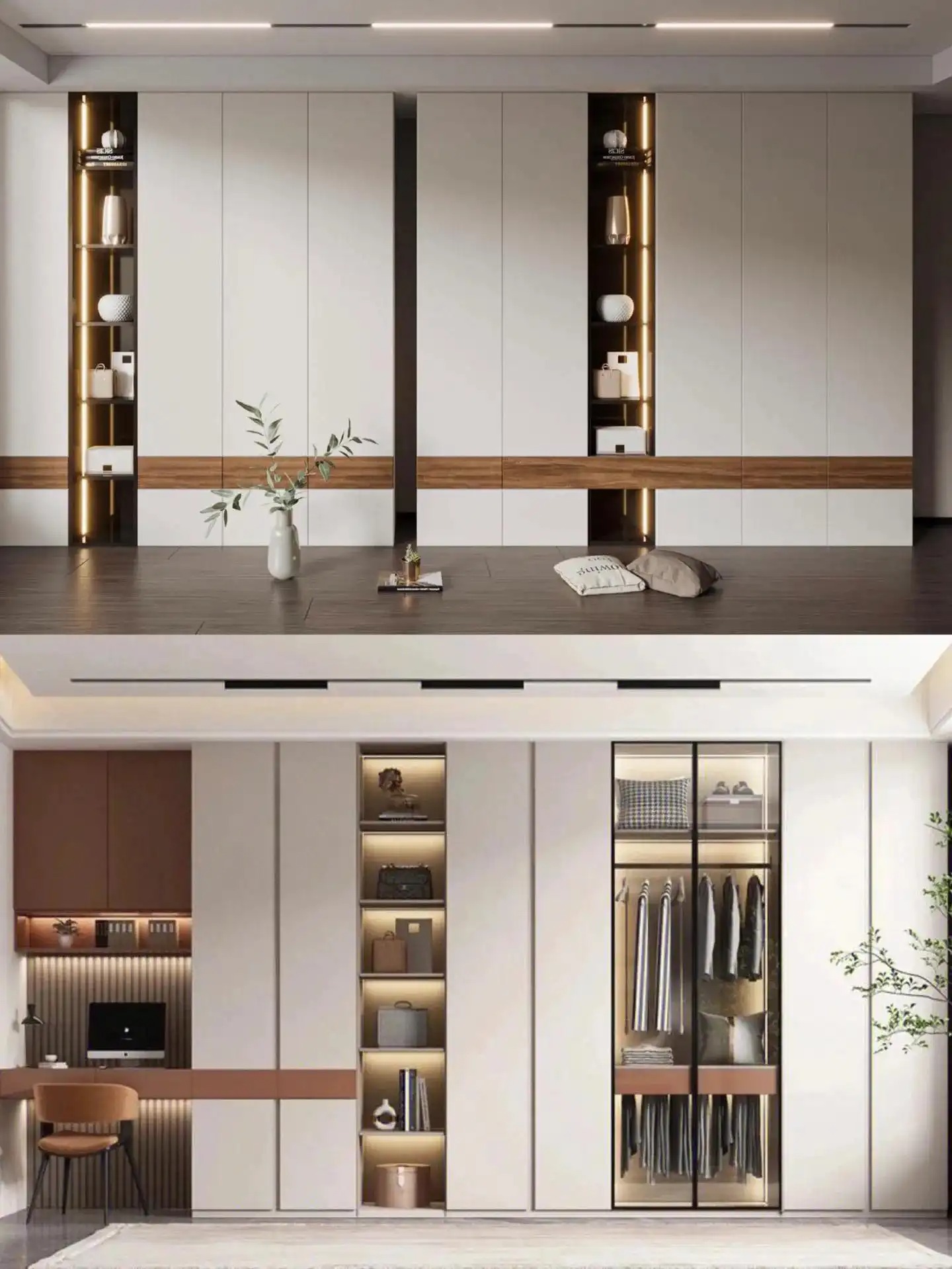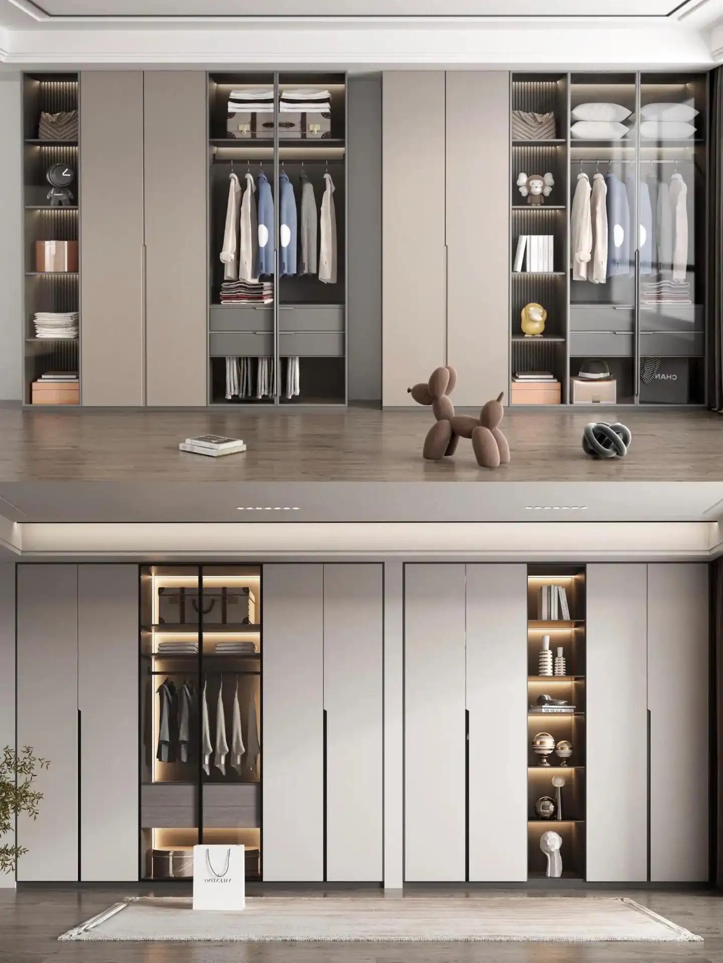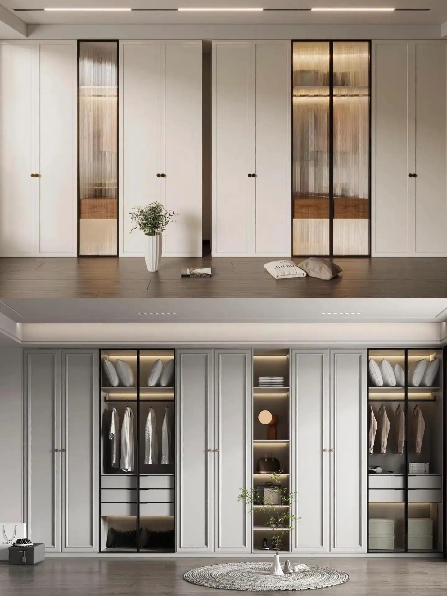 一门到顶设计搭配玻璃门,嵌入式灯带作为点缀,高级感满满,挂衣区叠衣区根据需求来定制,不同衣物都能随取随放,方便快捷