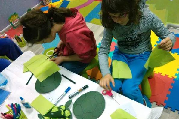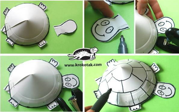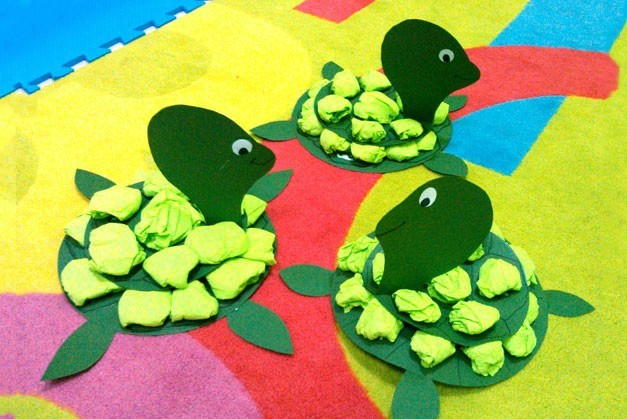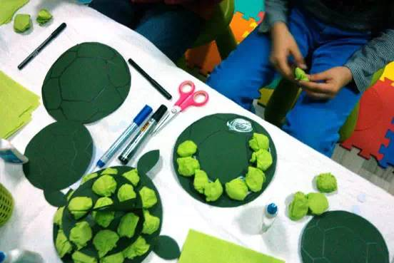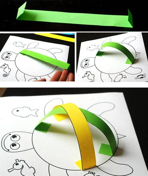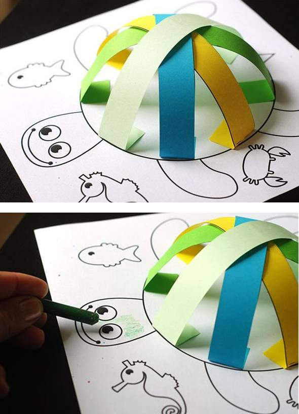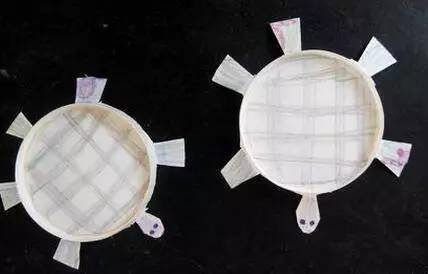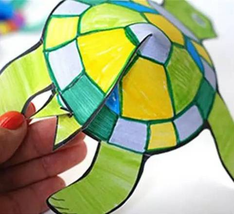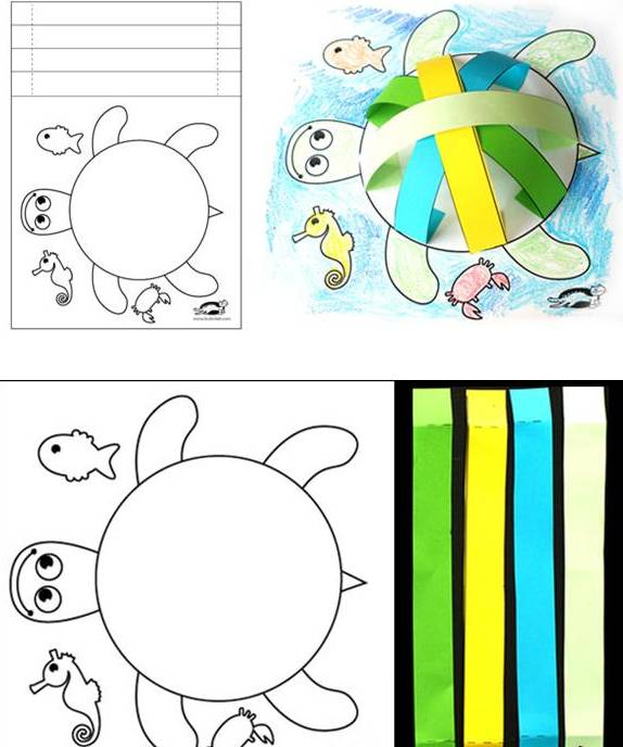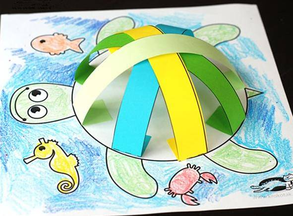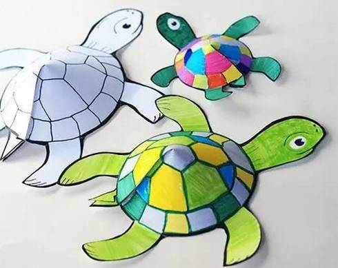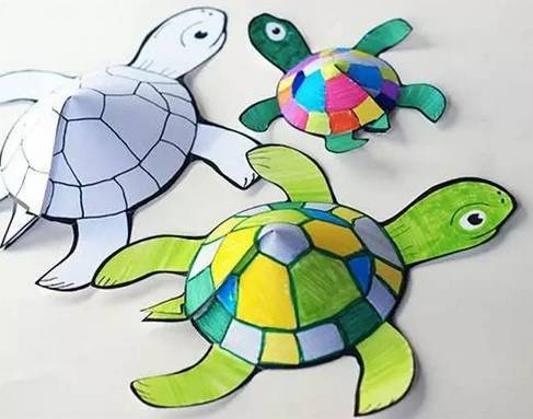 制作方法:先在纸上绘画出小乌龟和它的小伙伴们,再用彩纸剪成的纸条,粘贴在它的背上变成壳,一只立体的小乌龟就出现啦!