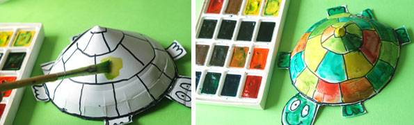 第三步:将小乌龟涂上漂亮的颜色,可以运用多种绿色交替涂色,也可用彩色装点龟壳哦!