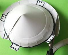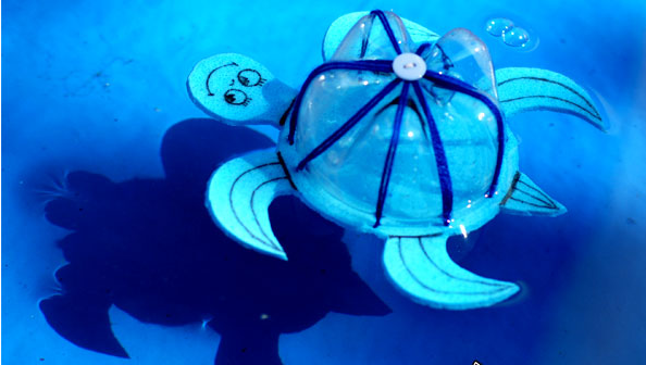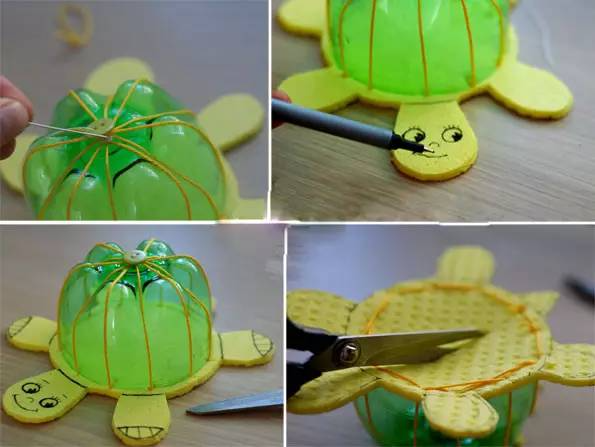 用剪刀把EVA上的乌龟剪下来,把可乐瓶底倒扣在EVA乌龟上,做乌龟的壳。