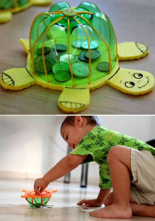 噔‘噔噔,小乌龟储蓄罐就完成啦,小朋友可以把爸爸妈妈给的硬币塞到小乌龟的肚子里存起来哦。