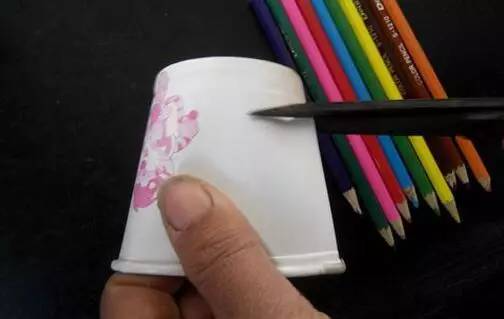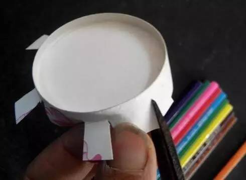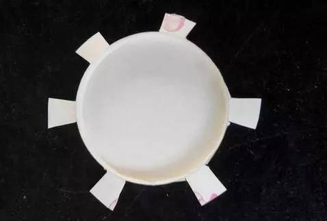 在纸杯前后相对的地方分别剪出一厘米的长度,然后压平;