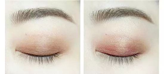 第二步:接着使用深一些的棕色眼影画在上眼影的眼窝内,珠光橘色眼影点在上眼影的前三分之二位置,注意一定要少量。