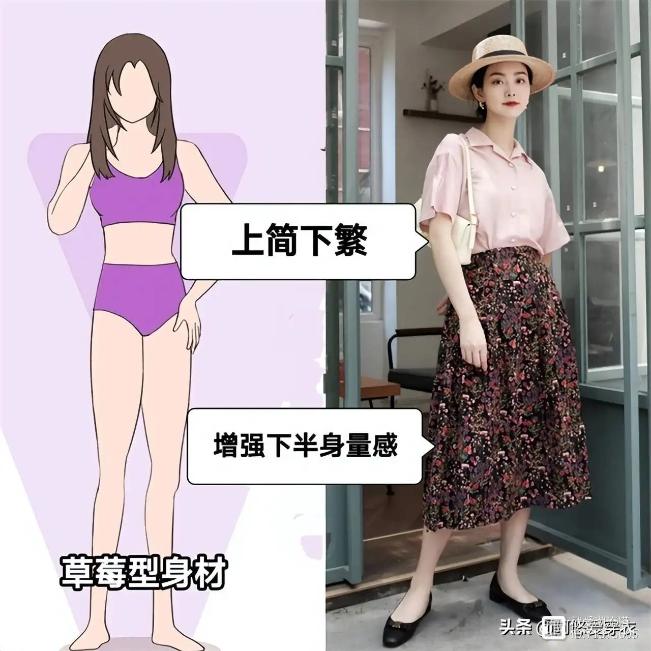 要是换成肩部超宽,腿部超细的草莓型身材,重点就变成了去平衡上下重心。多使用上简下繁的搭配方式,将重心转移到下半身。