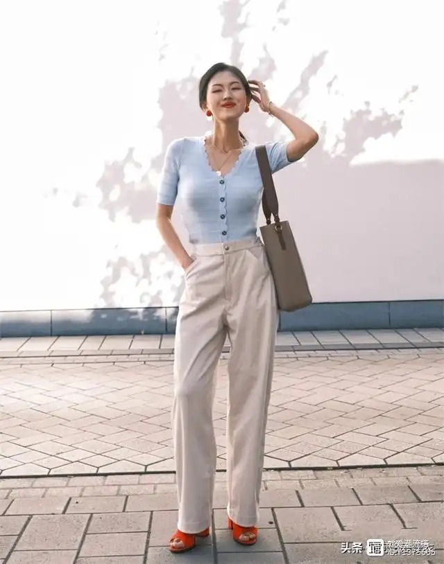 淡雅的天蓝色配上米色阔腿裤,适当放大下半身,让肩宽不再明显,距离完美身材就越来越近啦!