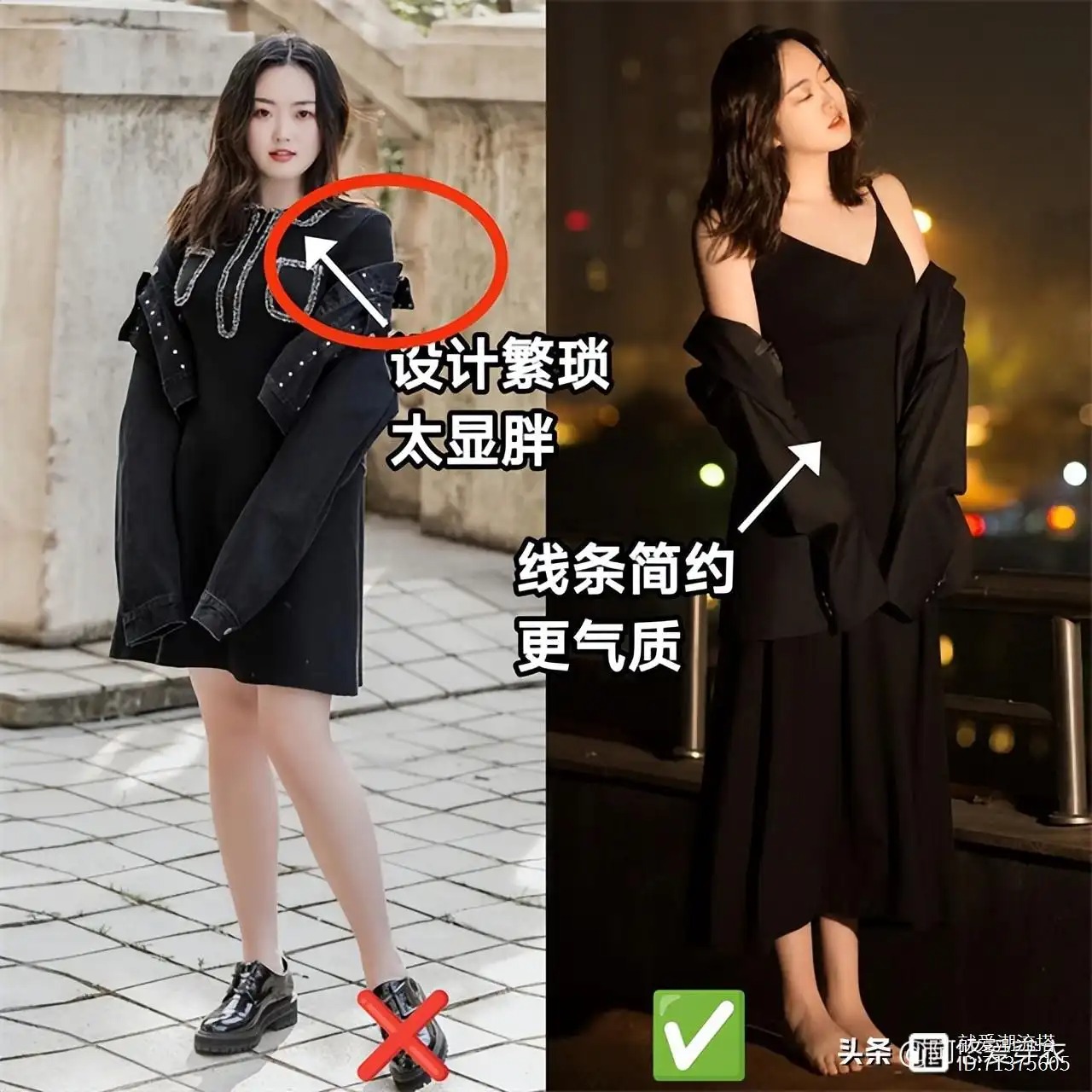 背部较厚的姐妹上半身的线条一定要简约,多选用直线条或斜线条削弱背部的厚度。除此之外,还可以选择适当露肤或深色来达到更好的视觉显瘦效果。