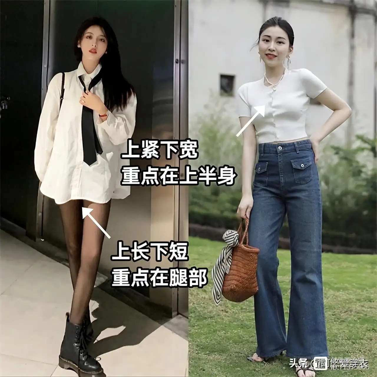 如果想突出自己的腿部,那就用上长下短的下衣失踪法。想突出凹凸有致的上半身,上紧下宽的穿法必不可少。