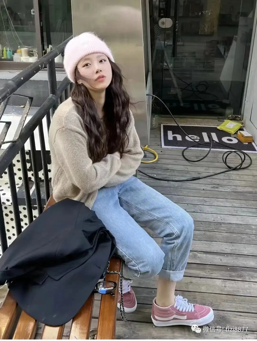 韩系叠穿,粉帽子+粉鞋+线衫,就是软软的一个萌妹,加上西装之后会增加一些气场,戴了眼镜呼应一下西装,算是1套2种不同的感觉~~