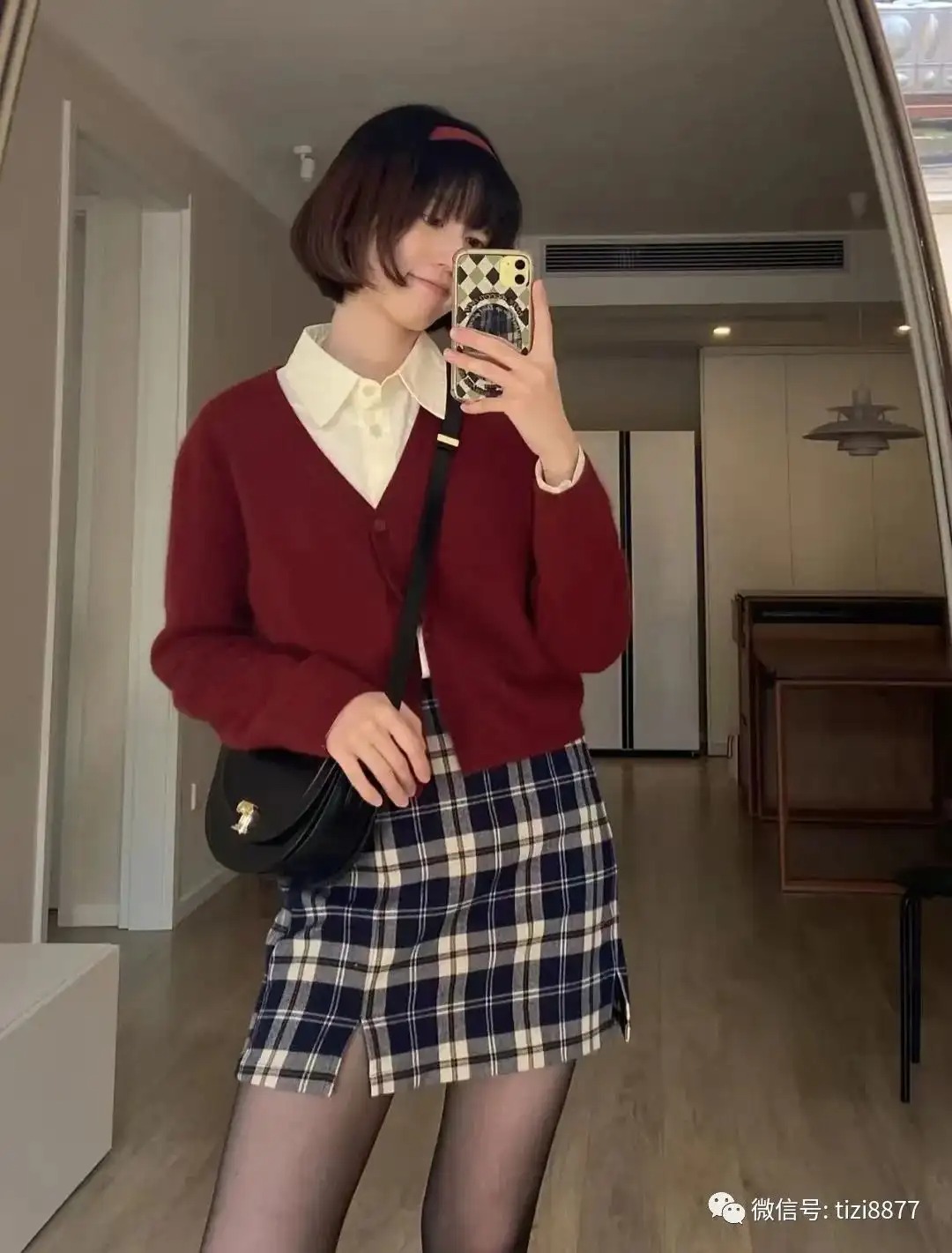 look6 灰色小西装+红开衫+格子裙