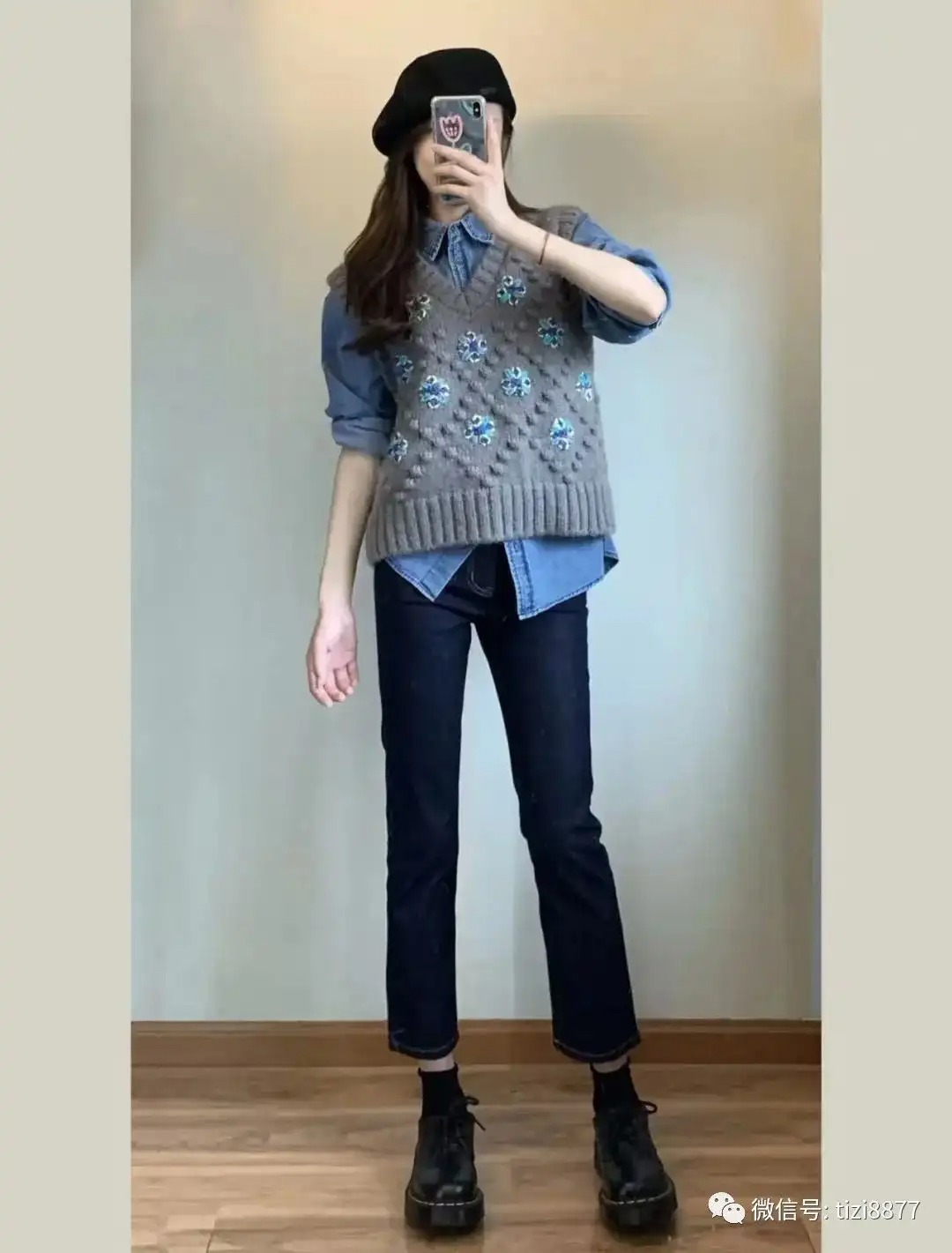 打破沉闷僵局,快乐是叠穿小马甲给的,精致的蓝色钩花对应蓝色牛仔衬衣和谐,搭配贝雷帽拿捏韩系慵懒休闲感,直筒裤和厚底鞋显高双刃剑~~