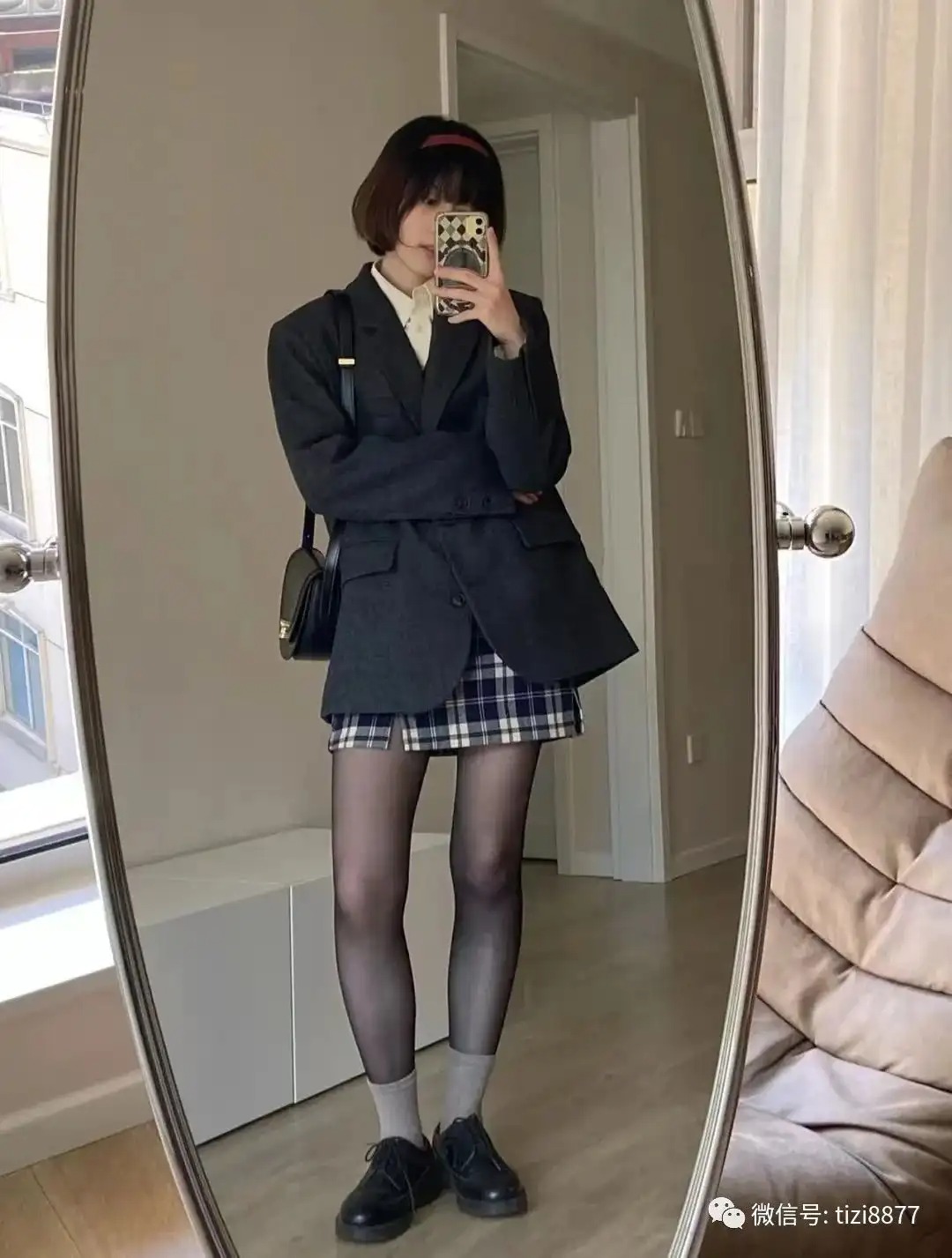 衬衫/毛开衫+格子裙+黑丝,已经是一套经典学院风穿搭公式了,套上板板正正的西装就变得韩里韩气了,有点小正式感又不失可爱~~