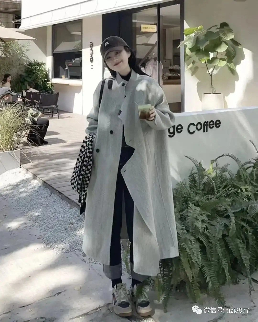 look5 灰色人字纹大衣+深蓝牛仔裤