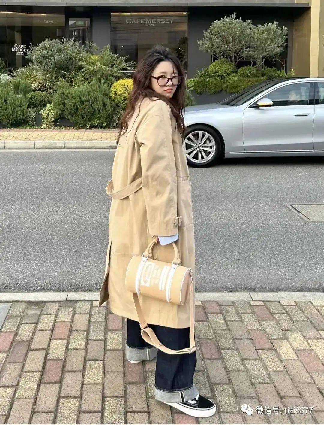 奶咖色大圆筒包+风衣+衬衫+牛仔裤=很街头随性的一套,同色系的包包和风衣,棕色调在秋冬真的king~~