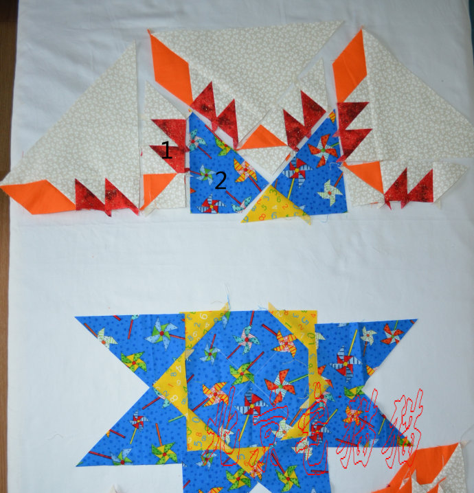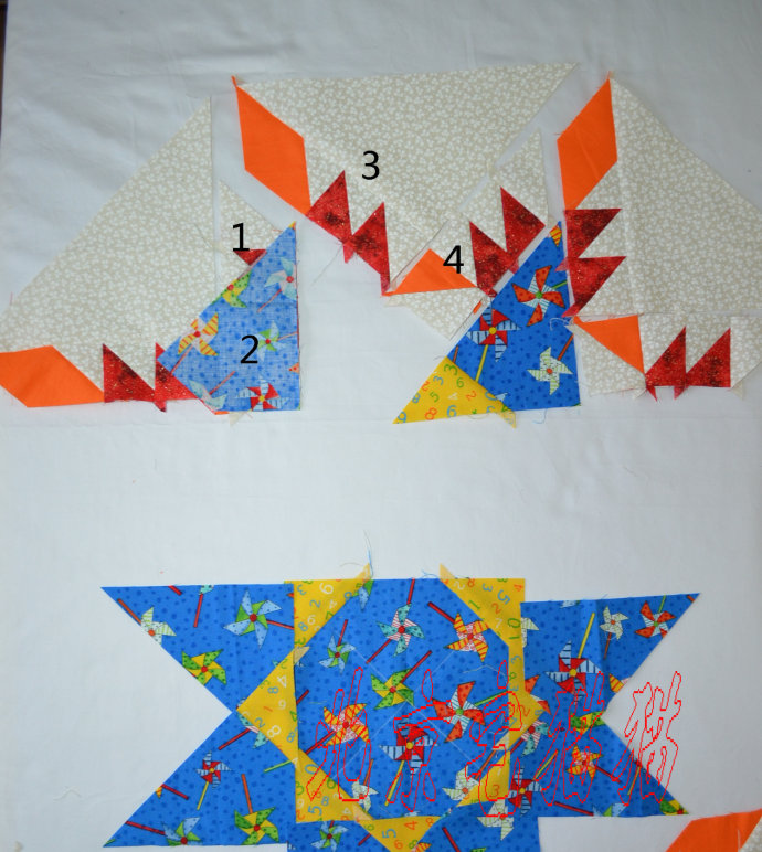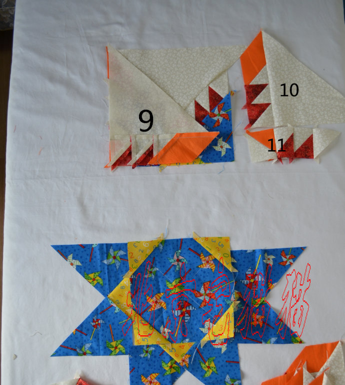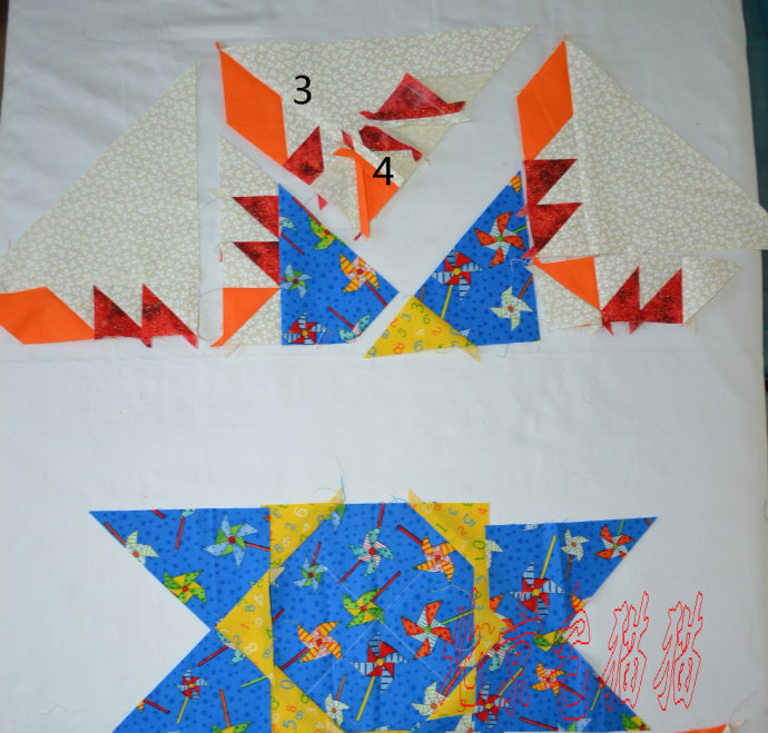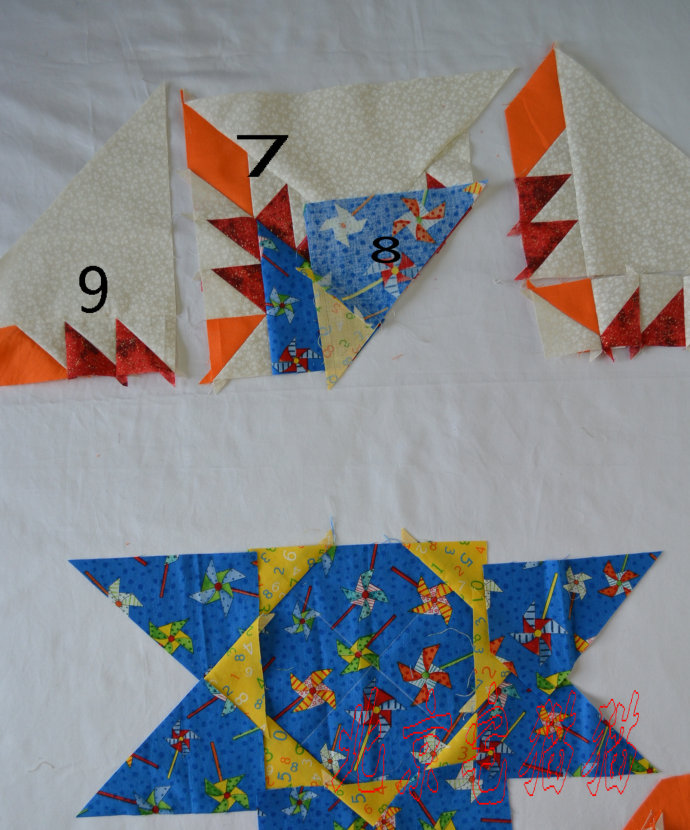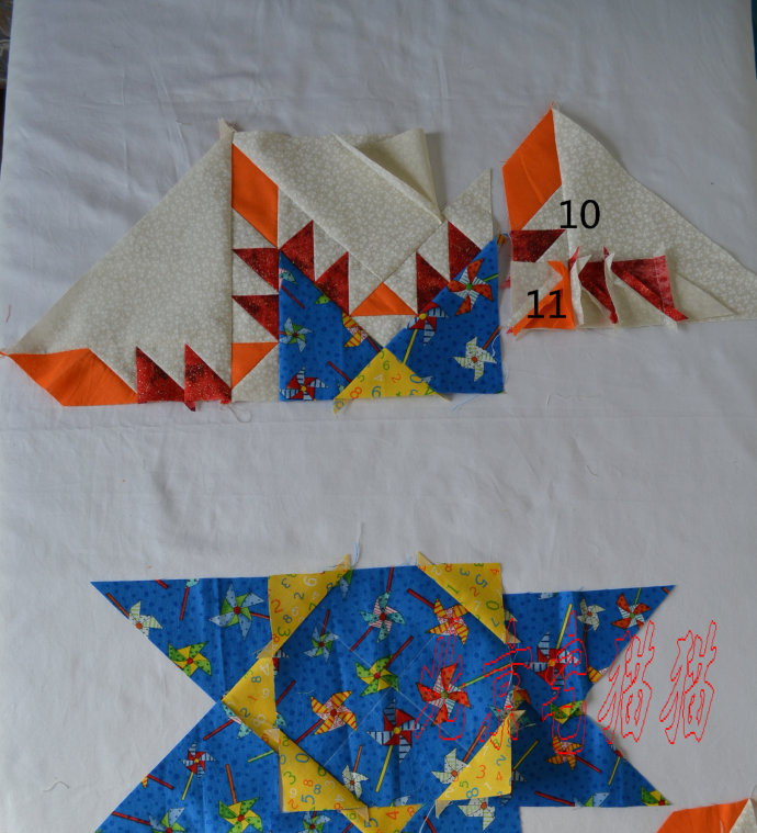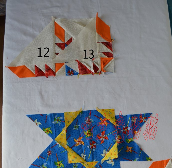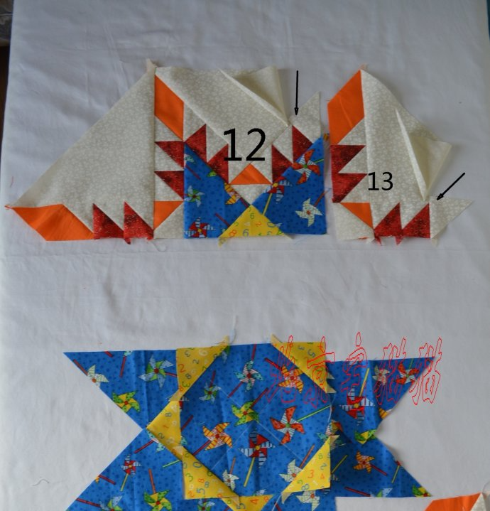 箭头所指的位置先不要车缝上。拼接12、13布片