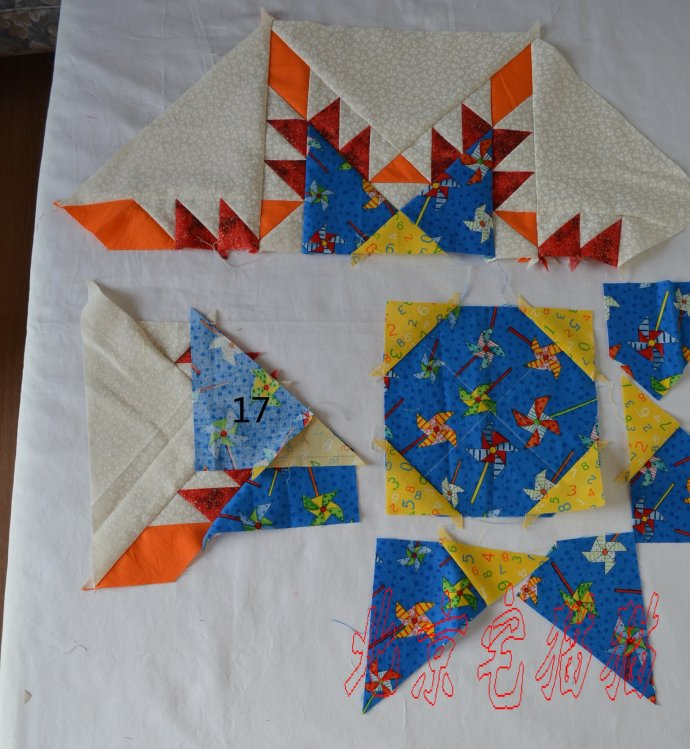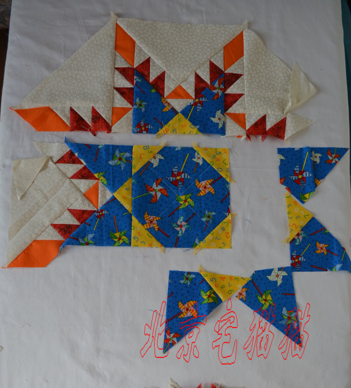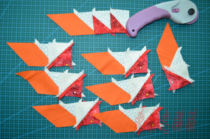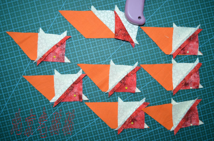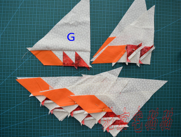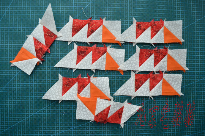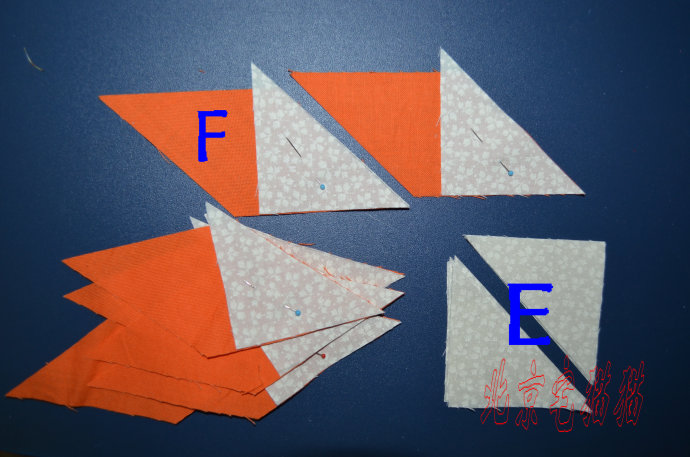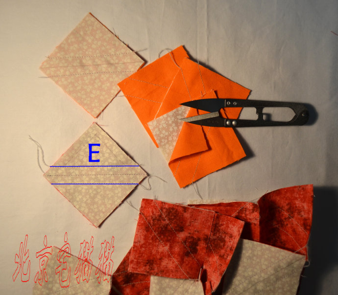E是小羽毛布片,这个成品小羽毛是设计为3个,E是k+2.5cm的正方形,一共48片,白色的28片,红色的16片,橙色的4片。一片白色一片色布片,正面对正面,沿着对角线+0.7cm缝份车缝两道,再切开对角线,展开烫平,背后缝份两边倒。
