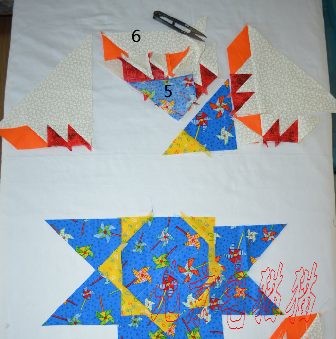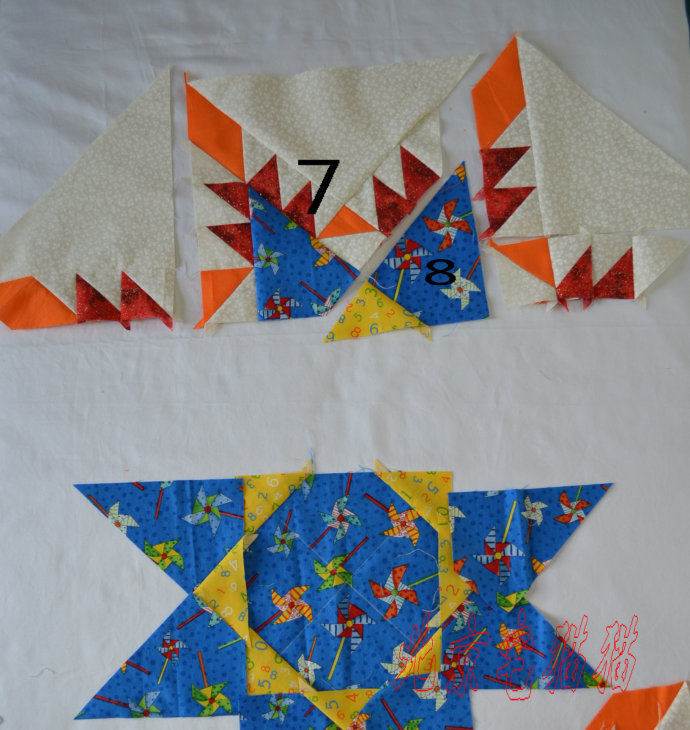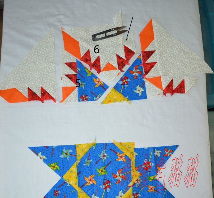 黑色尖头所指的位置,先不要车缝上。再将5、6拼接
