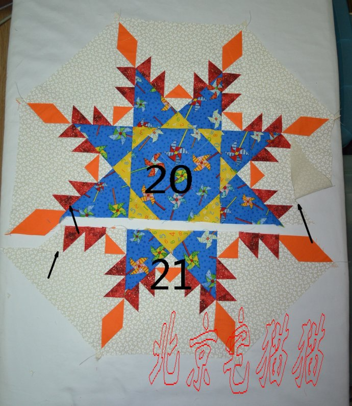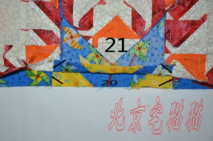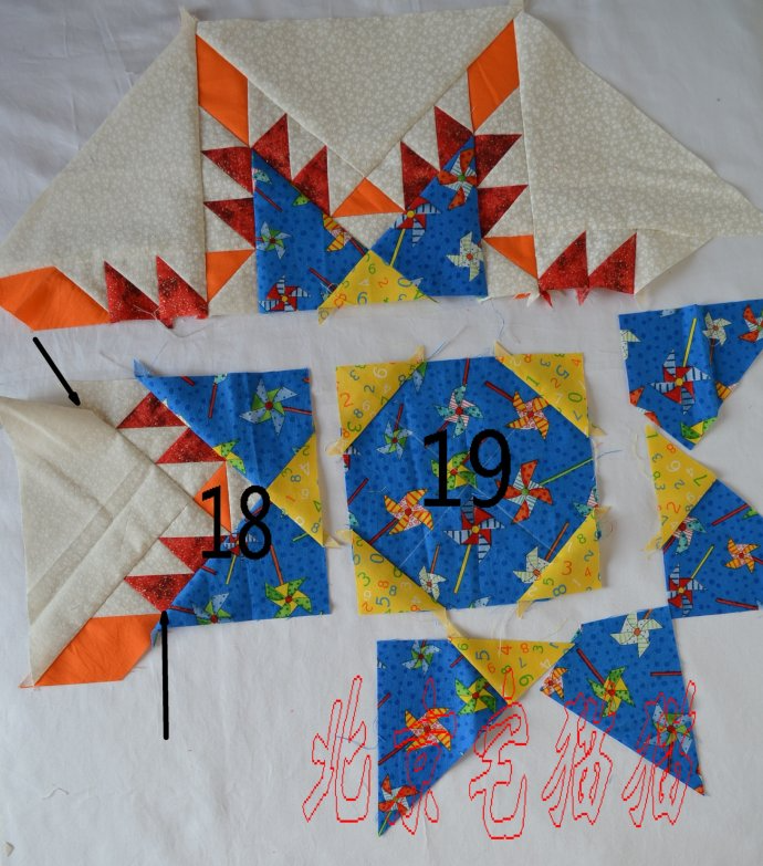 箭头所指的两个位置,先不要车缝。拼接18、19布片
