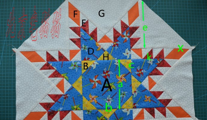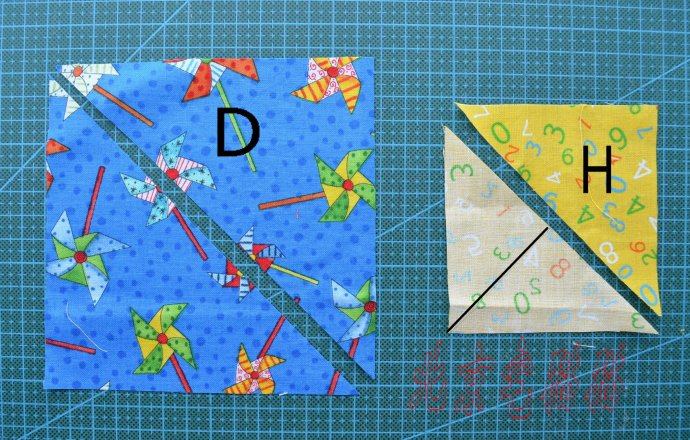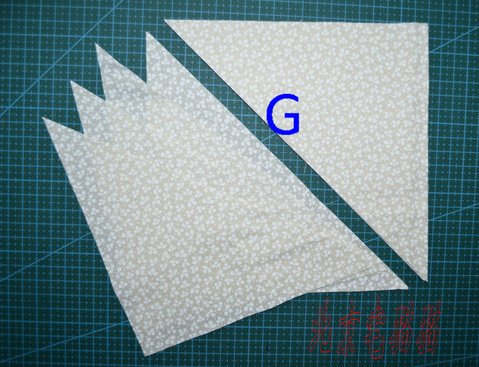 G是外围的大三角,是e+2.5cm的正方形,4片,对角线切开,形成8片大三角。如果想要成品是正方形的,这里就需要2片切对角线的;另外再裁e+1.5cm的正方形4片,拼接在四角,成品就是正方形的。
