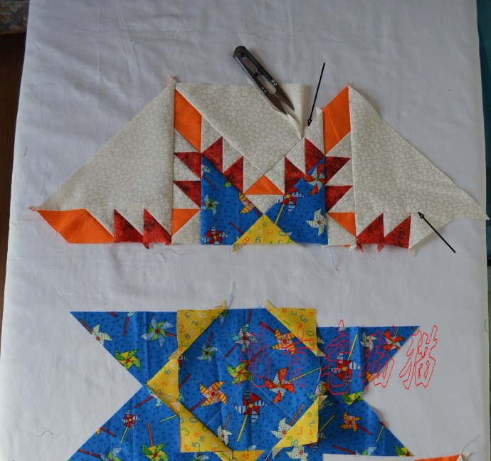 12、13布片拼接好后,再将前面步骤没有车缝的位置补车缝上,就是纱剪所指的箭头位置。下面的那个箭头位置是要在拼接中间横条后再补车的。