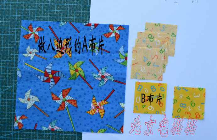 从中间的八边形开始,A是a+1.5cm(两个缝份)的正方形,一片;B是c+1.5cm的正方形,4片。