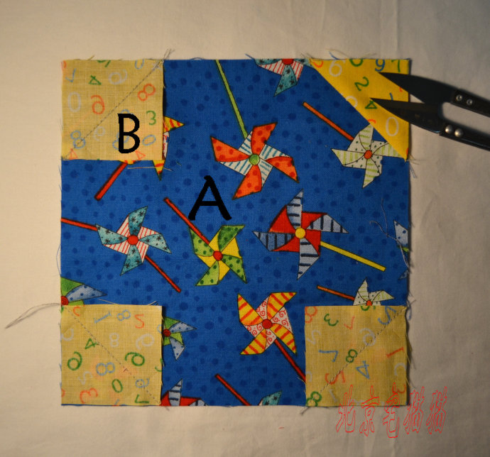 B放在A的四个角上,对齐,车缝对角线,切掉多余的角,翻折B布片就形成正八边形。