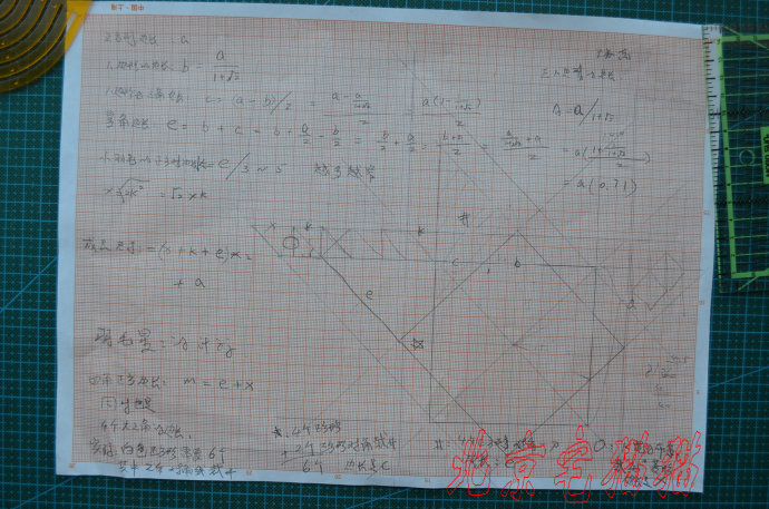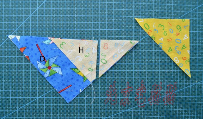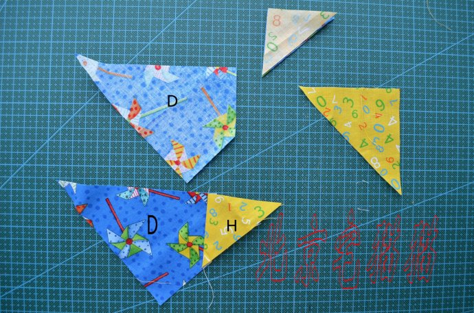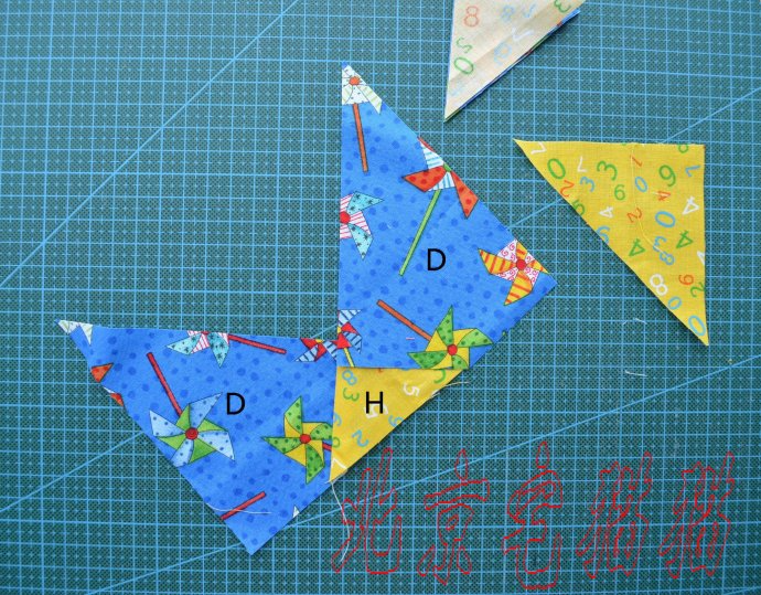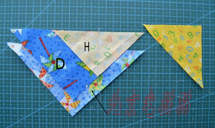D是大羽毛,是b+c+2.5cm的正方形,4片,对角线切开,形成8片大羽毛。H是八边形的外角小三角,是b+2.5cm的正方形,2片,对角线切开,形成4片小三角,要先在对角线上划线,方便下面的拼接步骤。