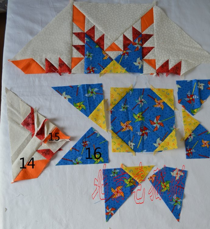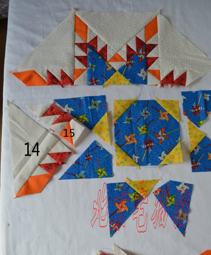 继续拼接中间横条。14、15布片拼接,注意,仍然不要车缝到头。