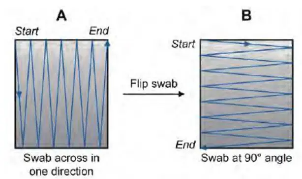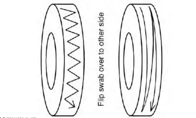 ISPE针对棉签擦拭取样有一个其他指南未明确提的要求,我们在执行清洁验证时,通常在方案中描述的清洁方法只是针对平面擦拭,但是从ISPE指南中可以看到,其对其他特殊形状表面的取样也进行了举例和描述。基于此,可以在清洁验证方案中针对不同的设备内表面进行分类,并对不同类型、不同大小的材质表面分别规定具体的取样方法,更加符合实际,对清洁验证的开展更有指导意义。下面具体描述ISPE的这份清洁验证指南对擦拭取样的要求。棉签取样面积一般是5cm×5cm,如果产品限度较低,也可以采用10cm×10cm,除此之外也可以通过增加进样量、减少棉签的提取溶液体积、也可对提取溶液进行适当浓缩。取样时不建议使用方形框架来勾勒擦拭区域,因为取样过程中棉签可能碰触到方形框架,从而出现样本污染,如果在每个取样点前进行更换或额外清洁则可能带来其他风险。另外,当棉签接触到方形框架时,也可能出现棉签和框架之间的挤压,导致收集的样本流失。同时,在实际取样时也很难同时握住取样瓶、取样框架和取样棉签。(有些检查员在GMP检查时可能会要求企业使用方形框架,企业可以参考ISPE的描述进行解释。)应使用低TOC和无菌棉签分别用于TOC和微生物负载测试。随着时间延长,有些棉签中的可提取物可能被提取出来,从而影响测试的准确度,在清洁验证的方法开发及验证中,应对棉签的选择进行相应研究。通常建议每个取样点使用1个棉签,除非单个棉签的回收率经过多方面论证确实不能满足需求时,可使用多个棉签进行取样,并作为一组样品来代表实际的取样过程。棉签在使用前应使用溶剂润湿,溶剂应能溶解目标残留并于萃取溶剂相容。一般可使用易挥发的有机溶剂,如甲醇、乙醇,以防止在设备表面产生残留。当进行TOC取样时,建议使用纯化水或注射用水润湿。应注意棉签取样的顺序,首先取微生物负载样品、再取TOC样品以防止有机溶剂影响、最后再取使用有机溶剂的样品。擦拭取样的具体步骤包括:使用溶剂润湿棉签、在溶剂瓶口适当挤压以排出多余溶剂、使用足够的力量使棉签和取样位置充分接触、按照预定方向移动(参加下图)、翻转棉签、以垂直方向擦拭同一区域。