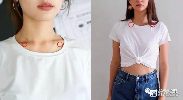 低圆领的选择,最好是可以露出锁骨为最合适的领口,否则圆领过低容易走光,过高容易更显胖,造成视觉横向延展,俗称越穿越显壮和胖。
