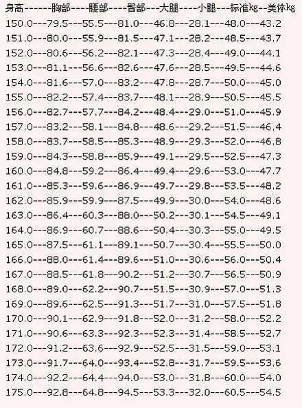 身材对照表,精确到小数点。留着监督自己用!