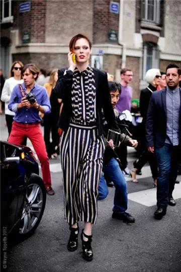 竖条纹的单品虽然让人感觉会挺拔不少,但是没有腰线却是打造良好身材比例的大忌!而在单品中巧妙的横条纹混搭,就很好的解决了这一点。