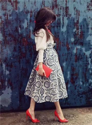 例如高腰裙、高腰裤。再配上刚好露出的脚踝,不但腿部被拉长,同时给人一种清爽感。