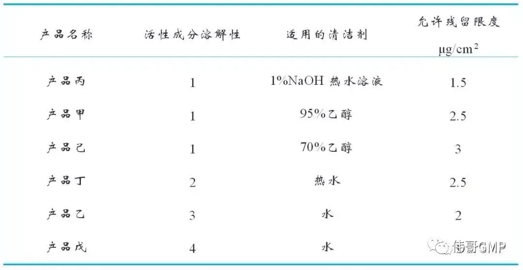 从表中可见,产品丙、丁、乙、戊,可用水溶性清洁剂清洁,应选最难溶的产品丙为参照产品,清洁剂1%NaOH热水溶液,允许残留限度定为1.5μg/cm2。产品甲、己用乙醇为清洁剂,可另算一类,应选择产品甲为代表产品,清洁剂为95%乙醇,允许残留限度定为2.5μg/cm2。