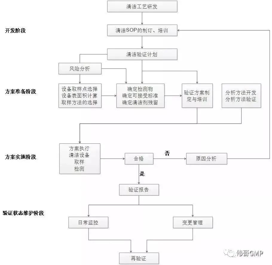 通常的做法是将清洁验证分为四个阶段,方法开发阶段、方案准备阶段、方案实施阶段、验证状态维护阶段,图1将各个阶段进行流程化,以下分别对其进行阐述。